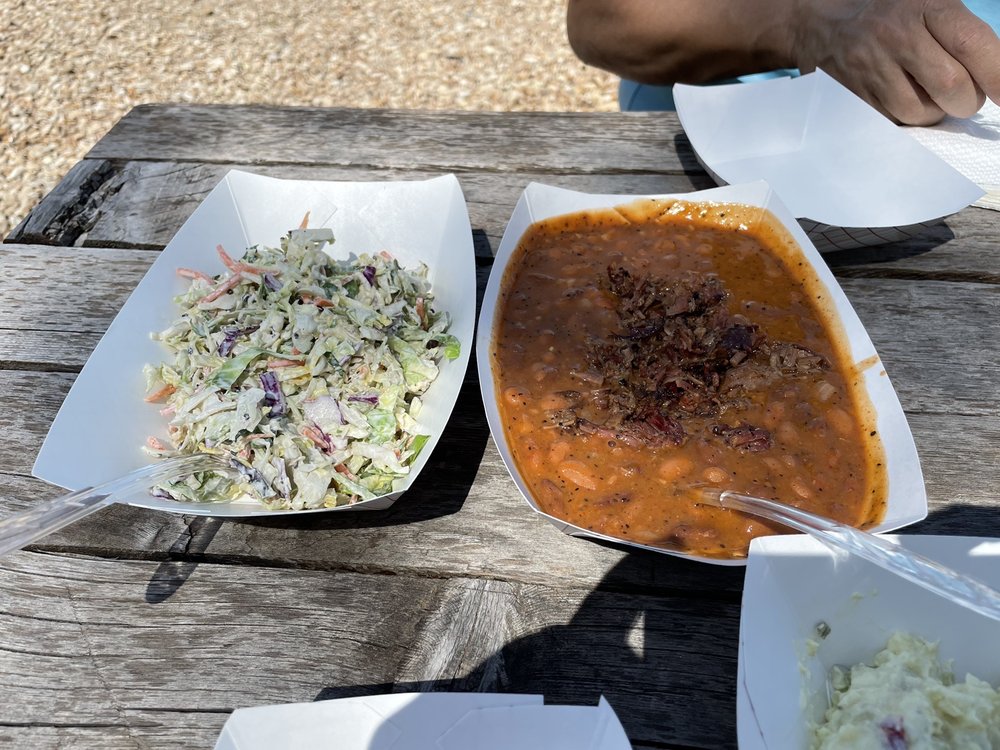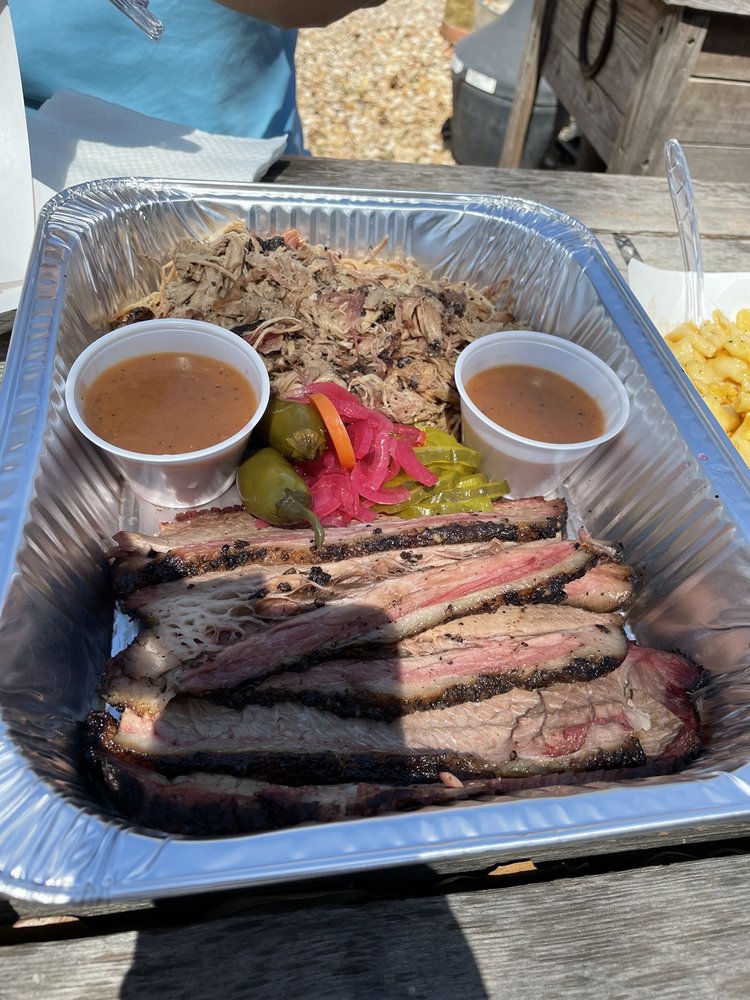 Food options are available on-site through a food truck that serves well-received BBQ dishes and sides like macaroni and cheese. Visitors often appreciate the combination of good food with their drinks in a casual setting.
